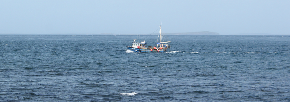 It’s a beautiful afternoon. Out to sea, a little fishing boat navigates the choppy waves of the Pentland Firth. Blue shapes of the Orkney Islands form a misty backdrop.