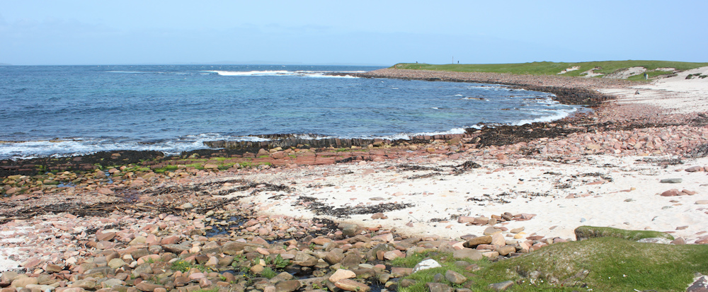 I’m walking towards a low headland. Check my map: the Ness of Duncansby. The shore here is mix of white sand, pink rocks, and grassy patches.