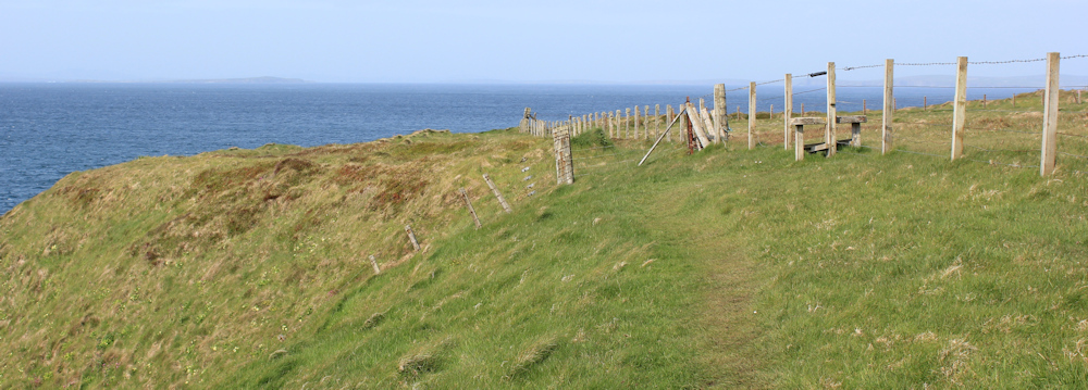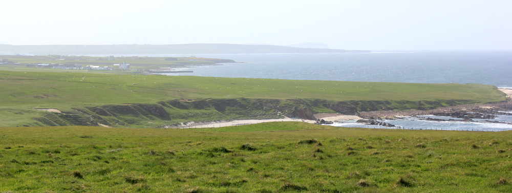 When I turn to look back, the buildings of John o’Groats are vague in the afternoon haze. The far finger of land is St John’s Point, with the wonderful Haven hidden from view. I can just make out the blue knuckle beyond – that must be Dunnet Head.