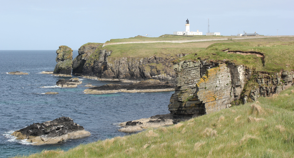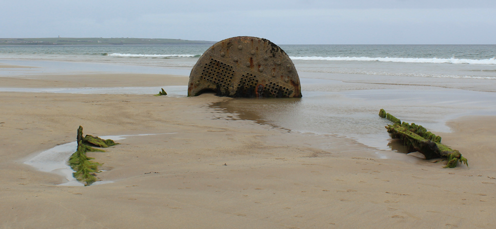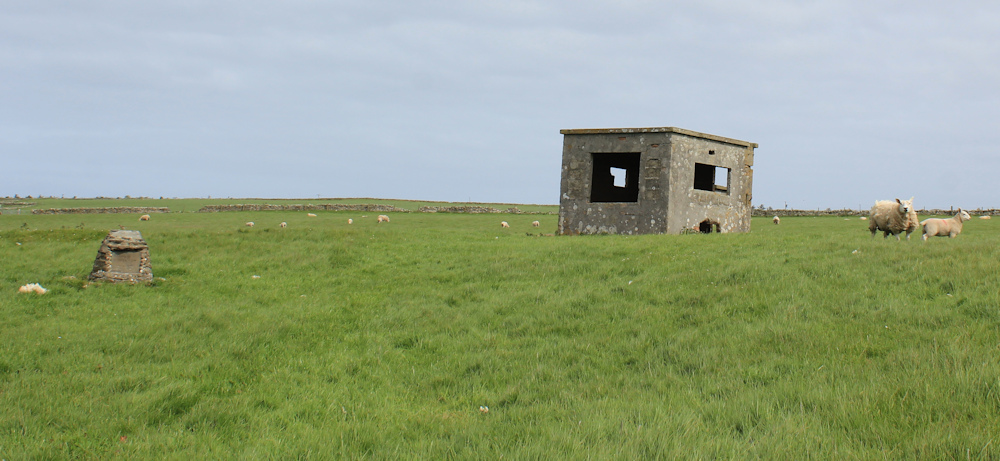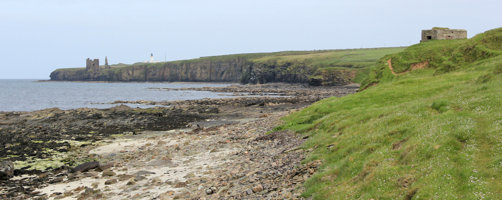 Onwards. I turn right along the shore, and follow a good path towards the distant shape of Noss Head. On the way, I pass several constructions that are probably the remnants of WW2 defences.