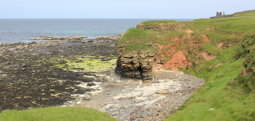 The dullness of the morning has given way to bright sunshine, and the landscape glows in the afternoon sunshine. The tide is out, but the cliffs here are interesting, with a mix of red standstone and harder rocks, little inlets, hidden coves, and sea stacks.
