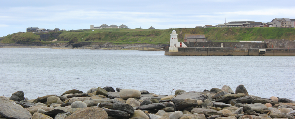 I stop to take photographs overlooking Wick Bay. The sun is out and everything looks fresh and beautiful in the sunlight. The lighthouse at the end of the harbour wall is the one I saw earlier from across the Bay.
