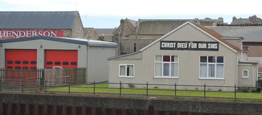 Next to a fire station, a sign on a building catches my eye. “Christ died for our sins.”