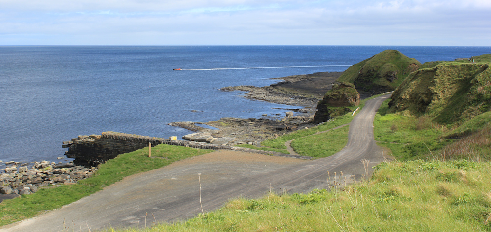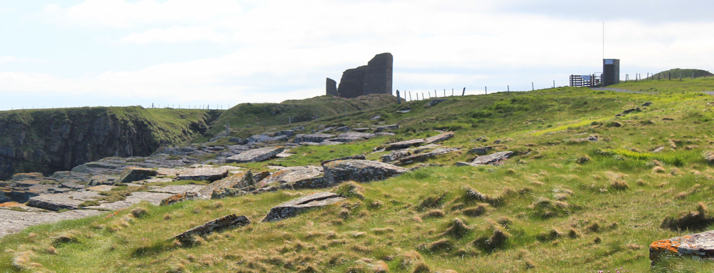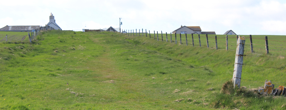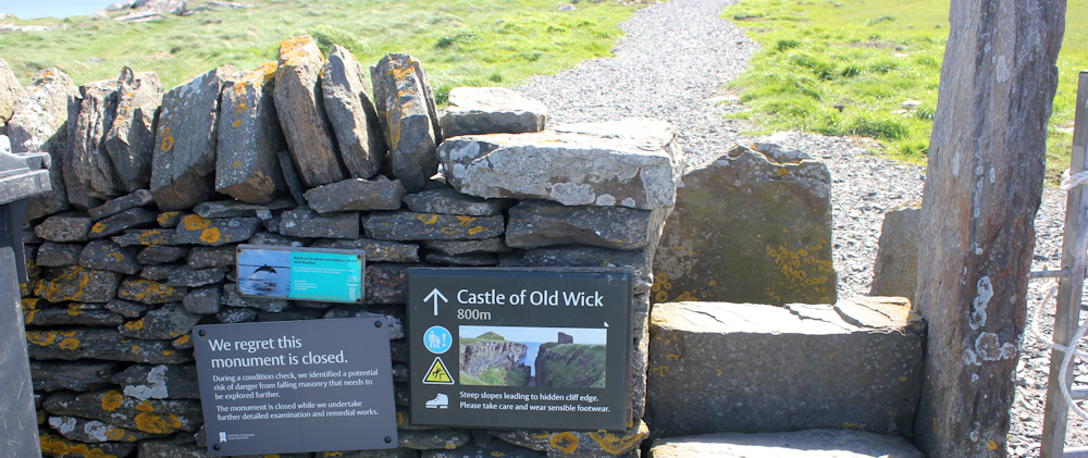 Climb up the bank again. This wall, at the end of the car park / turning area is, literally, the end of the road. A stile and footpath lead to the Castle of Old Wick. “We regret this monument is closed” warns a sign.