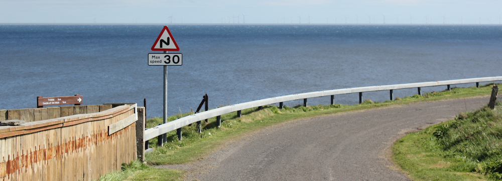 A wooden sign on the bend (just visible above the fence to the left of the photo above) indicates that to the right is the way to the Castle of Old Wick, and to somewhere called Trinkie. Further along, another sign on a rock points back the way I’ve come and holds one word: “CAVE”.