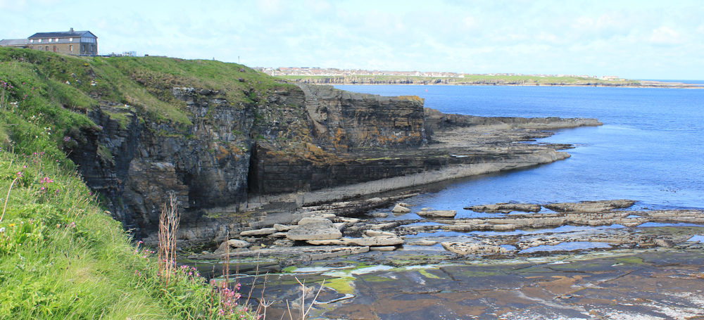 I may have left open countryside behind, but this is a lovely walk. A good tarmac path, interesting rocks below a bank of pretty pink thrift, and Wick is straight ahead.