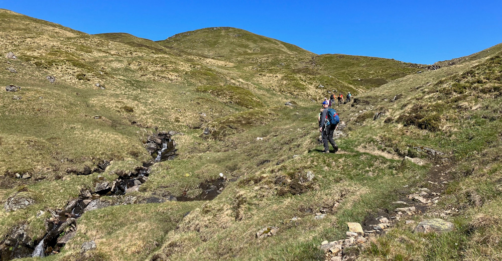 After an easy stroll along a gravelly track (some people used mountain bikes for this section) the path got steeper. We climbed up alongside a pretty stream with noisy little waterfalls.