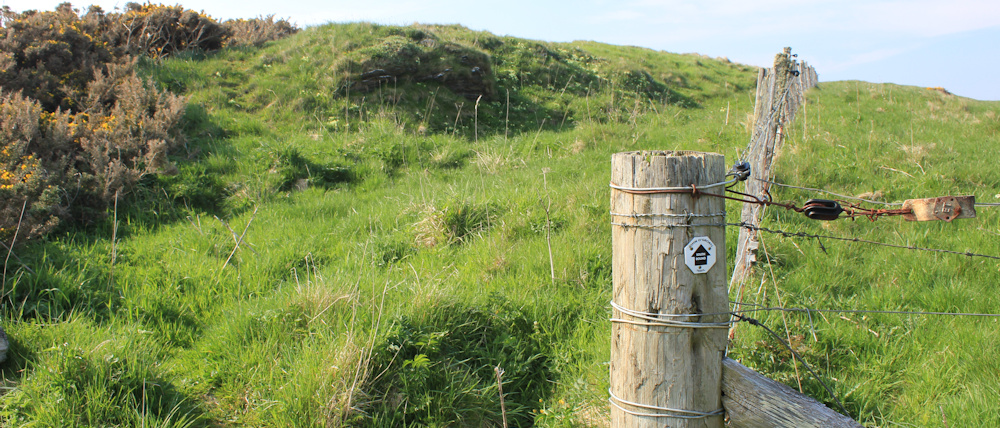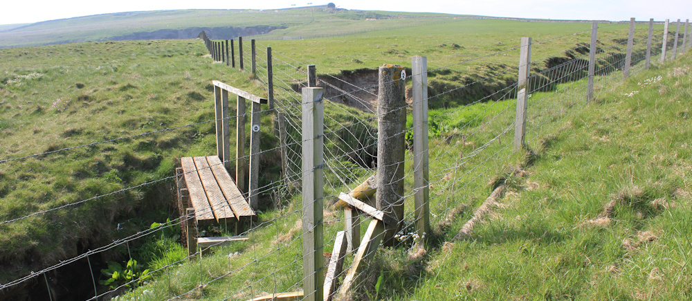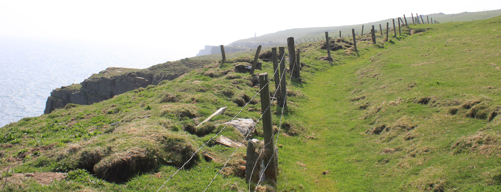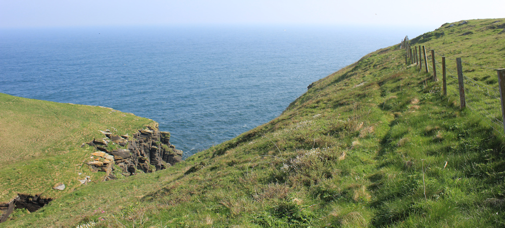I am tempted to walk on the inside of the fence, where the ground is much flatter, but there are cows in the fields, so I stick to the cliffs.