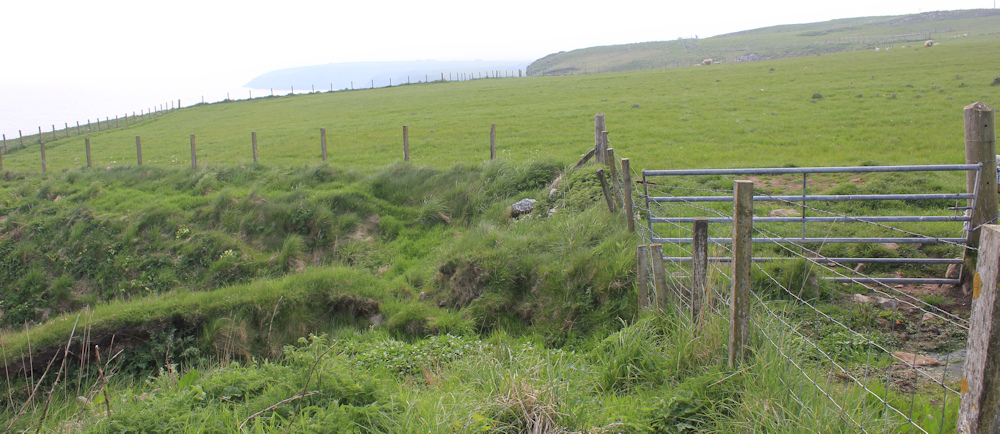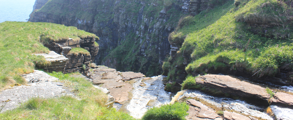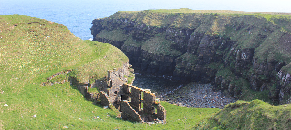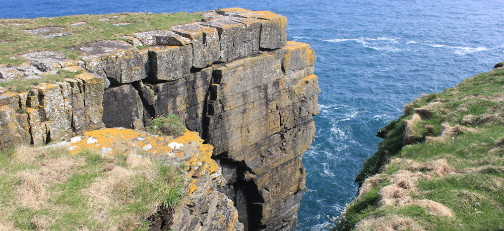 Downhill now, hurrying away from the cows. I stop to look back at Ousbacky (also known as Clythness Lighthouse) and take photographs. There are caves at the bottom of those staggering cliffs.