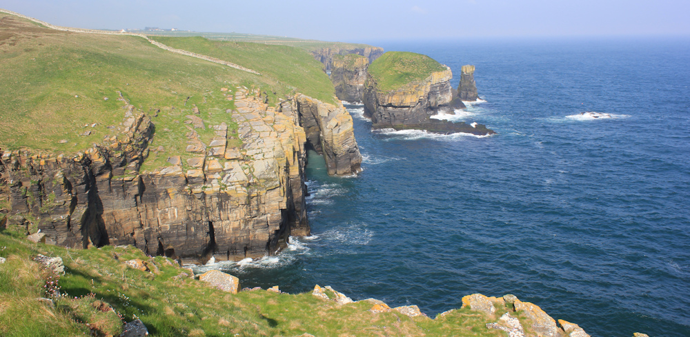 The next section of walk is along the top of the cliffs, with no geos to interrupt progress. In the sea below are numerous flat-topped rocky islands. Skerries. This one is Skerry Mor, I think.