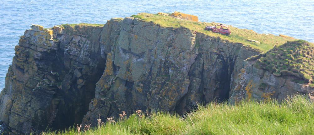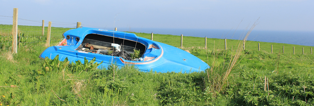 The next section of the coast has some odd features. This promontory is called White Head, but what you will really notice is the abandoned stock-racing car perched on the grassy slope. What on earth is it doing here?