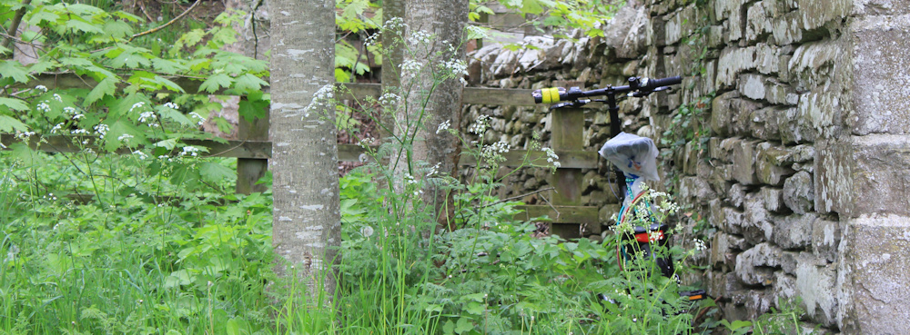 This morning, I cycled back to the end-point of yesterday’s walk, and left my Scooty bike chained up behind a wall. I always worry about leaving the bike… but he seems well-camouflaged in this spot.