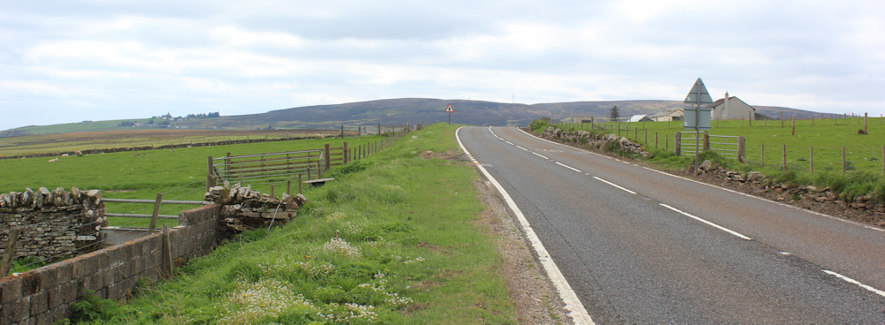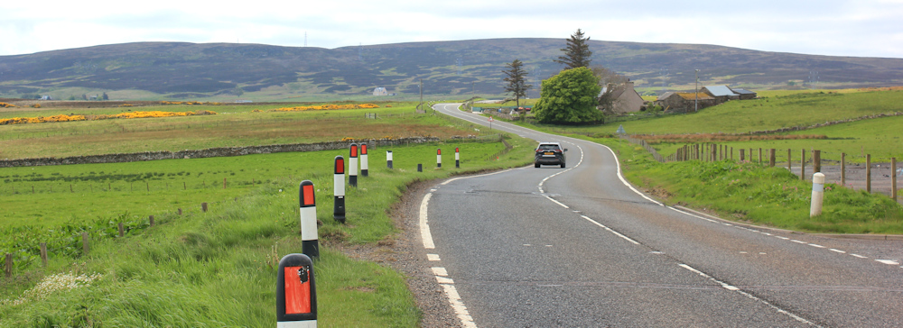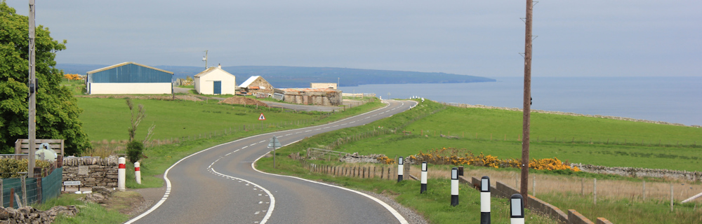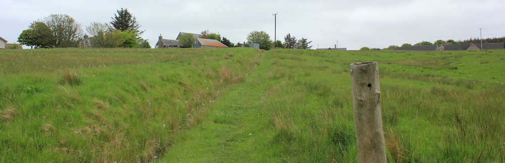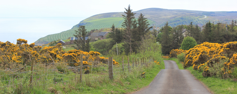 The road seems mainly uphill, and I am now walking high above the sea. The going is easy, but at times I am tempted to cut across the fields and find the John o’Groats Trail.