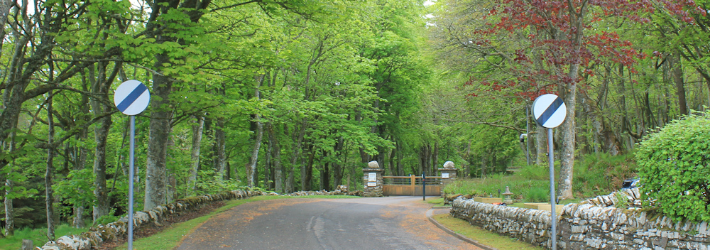 The road starts off well, with tall green hedges on either side, giving way to fields of sheep. I enter the woodland. Beautiful. Traffic signs inform me I can go at 60 mph if I want…. but… there are a pair of large gates ahead.