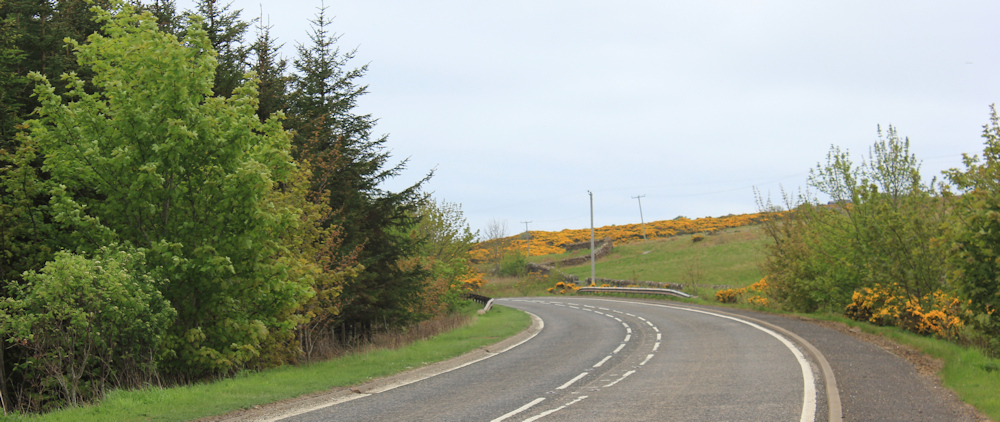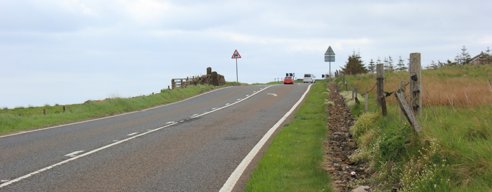 I’m going uphill again, and the road is veering further away from the coast. I stop to take a photograph looking back, and realise I can actually see all the way to the horizon. The sea haar (or sea fret) that has obscured the distant view for several days has finally disappeared.