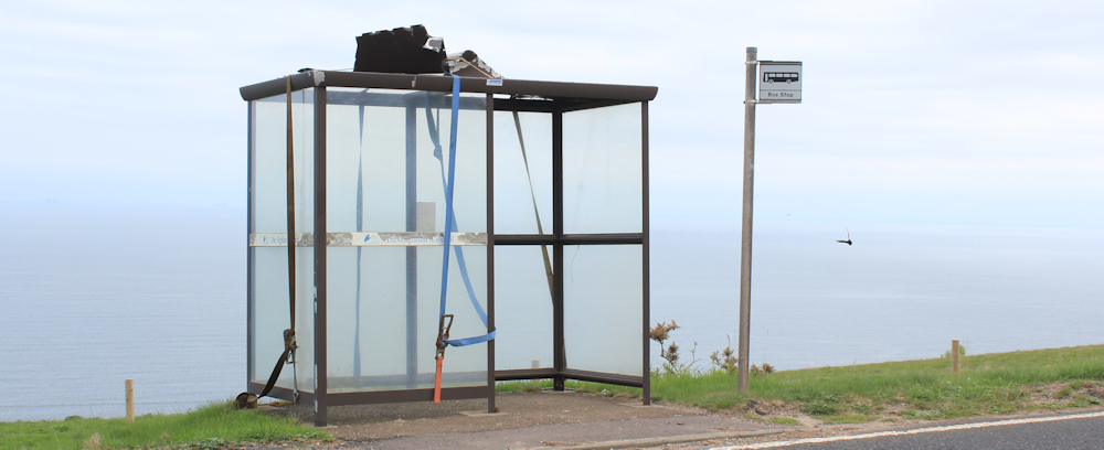 A bus stop by the side of the road looks the worse for wear. When I take a closer look, I realise the roof has been lifted off, and the whole construction is being held down by straps!