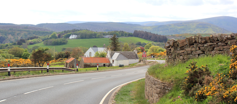The uphill climb finally levels off and the road might even be beginning to go downhill. There are hills ahead, and the sight of the higher land lifts my spirits. It’s good to see some nice highland scenery again.