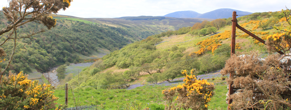 Oh, what a lovely view. That is Berriedale Water – and the fields are alight with bright yellow gorse, interspersed with blue lakes of bluebells – running in wide drifts down the slopes and covering the banks of the river below.
