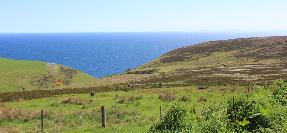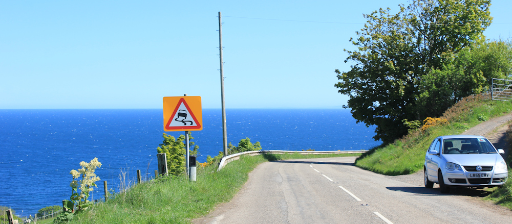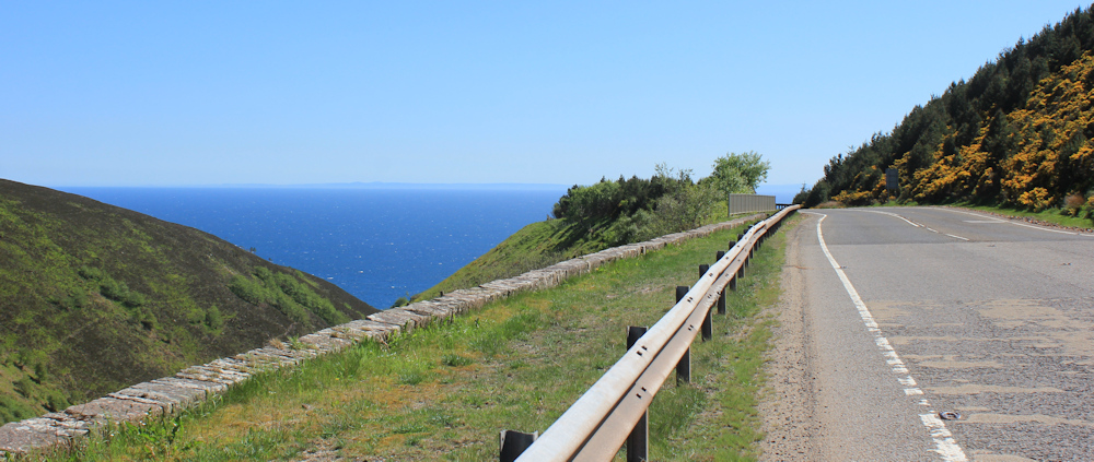 After a few twists and turns, I am heading back to the coast again. And, right across the blue sea, I can see the outline of the coast of Aberdeenshire. Aberdeenshire! Now, I really feel I’m beginning to leave the far north of Scotland behind!