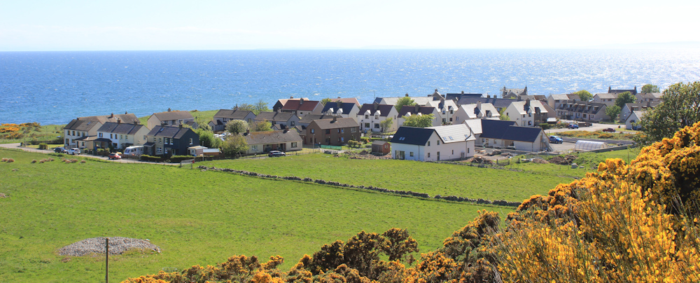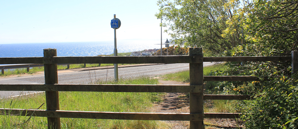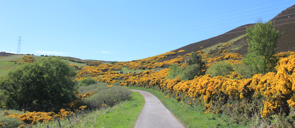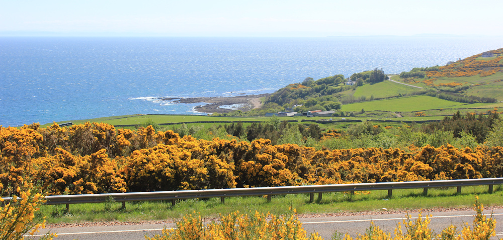 In fact, it’s a lovely, easy path. Fringed with yellow walls of cheerful broom and fragrant gorse. Below me is the A9, and below that – across green fields – is the sea.