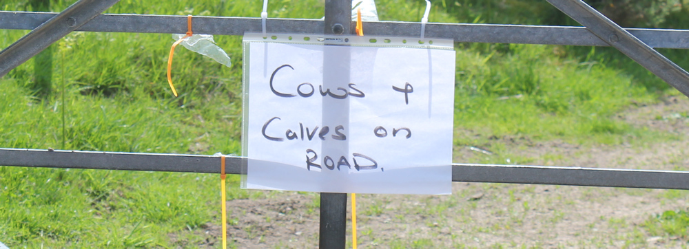 I don’t meet any dogs (or see any logs), but the next sign I come to is even more ominous. “Cows & Calves on ROAD”. Uh-oh.