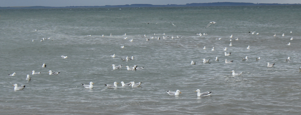 Along here, my youngest daughter suddenly gives me a ring. I sit down on a stone and chat to her for a good 20 minutes, while watching the sea. Full of sea gulls, bobbing on choppy waves. And seals!