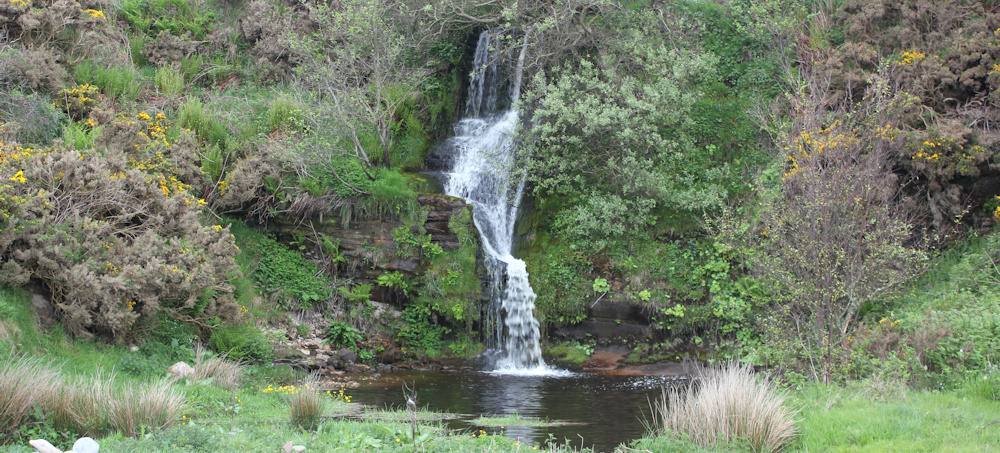 I pass a pretty waterfall on my right. It’s not marked as a waterfall on my map, but this may be where Sputie Burn drops down towards the sea. Beautiful.