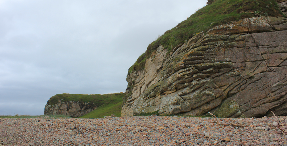 Dunes give way to cliffs. Look at the layers in this rockface! I sit on a nearby piece of driftwood, shrug off my ruck sack, and tuck into my picnic lunch.