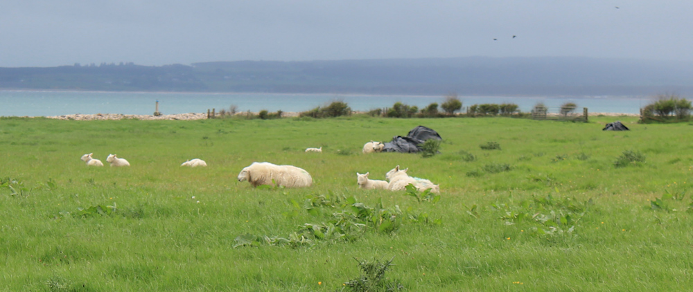 The cliffs are left behind, and I’m walking along a flat area. Fields of sheep to my right. A noisy, rough sea to my left. Misty hills in front.