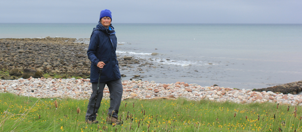 I come across a bench – a rare find on the Scottish coast. Stop for a drink and a snack, and a rest. (I do get tired so easily these days.) Then, I use the bench to support my camera while I set the timer to take a self-portrait.