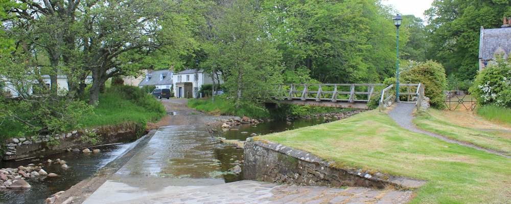 On the banks of the Golspie Burn, I turn inland to make my way back to the main road. Here I have a choice – ford or bridge?