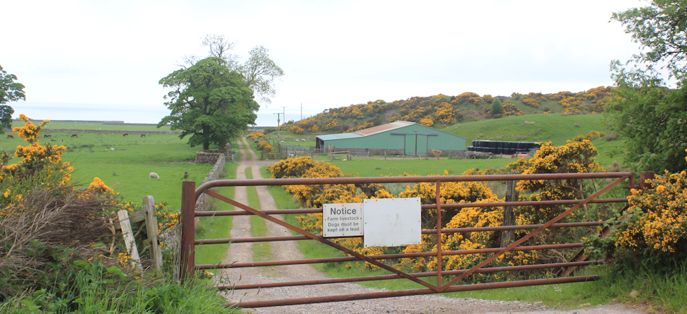 Soon, I can leave the road and rejoin the John o’Groats Trail. This is via a farm track that leads towards the coast.