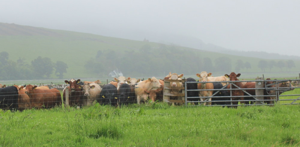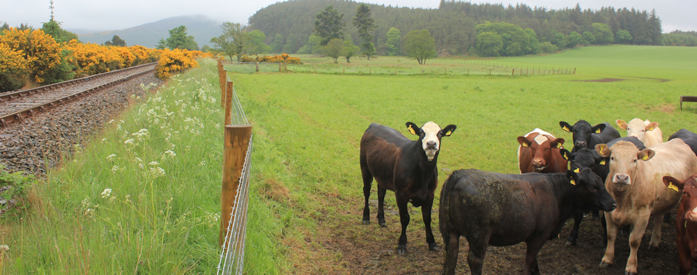Now, I know there are cattle in the second field, because I saw them from the road when I cycled along the A9 earlier. And I can just make out the beasts through the misty rain. Luckily, they are several hundred yards away, at the top of the slope.