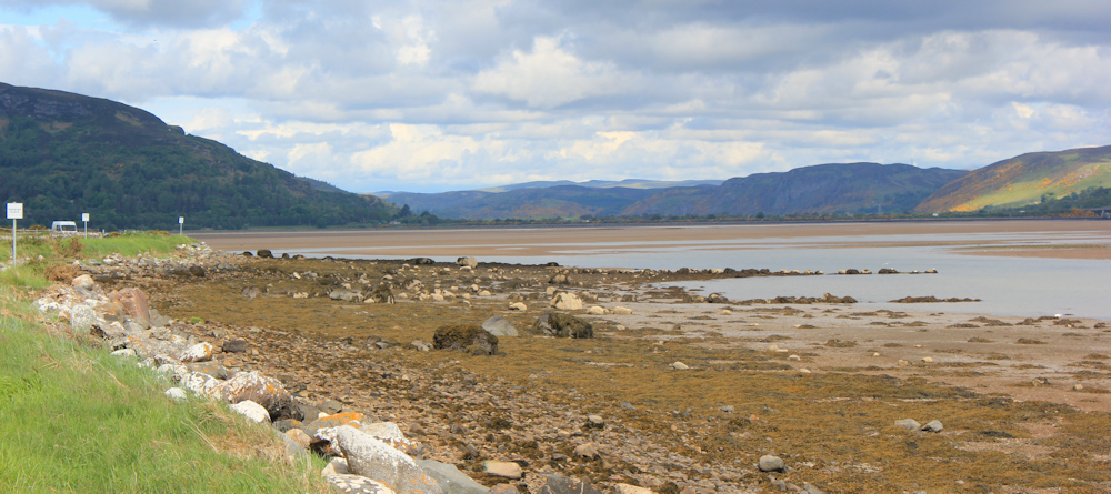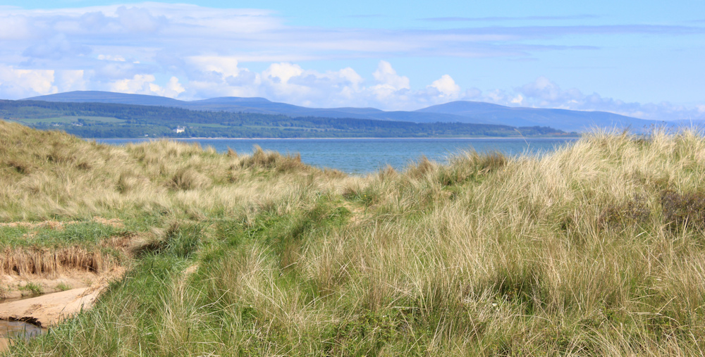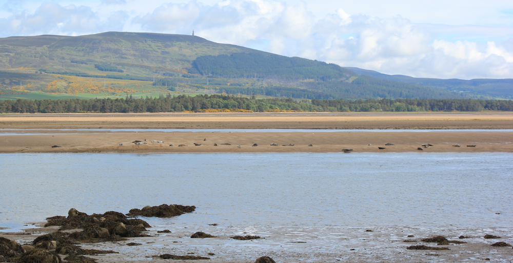 The sun is flitting in and out of thin white clouds. The landscape lights up – shifting areas spotlighted by the sunshine. There’s the vainglorious Sutherland Memorial on top of the distant hill, and the indifferent seals sunbathing in the middle of the estuary.