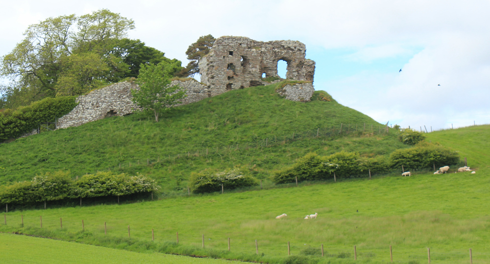 The guide directs them to look at Skelbo Castle, a ruined monument perched on a hillock behind the road.