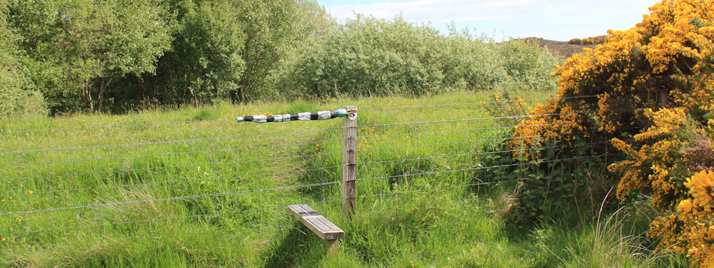 …but I can soon leave the track. First, I must cross a fence via a stile with a black-and-white striped barbed-wire cover, and…