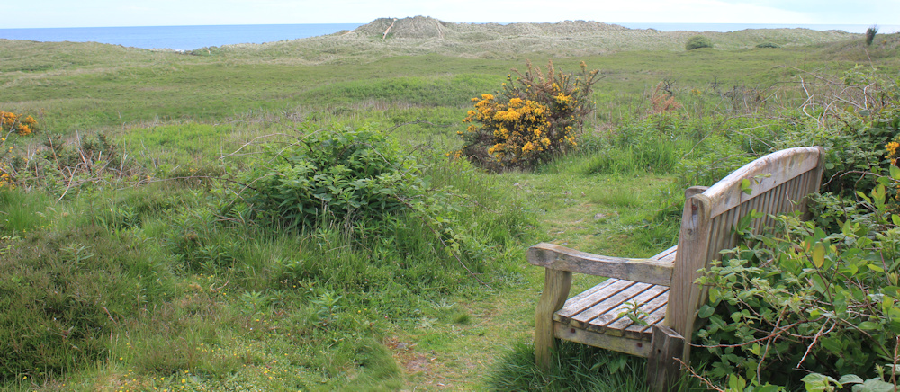 At this point, the path curves around to run parallel with the shore, still following the old railway line. But I leave the main path, and take a side path towards the dunes. After some false starts – there are dozens of little paths, and most of them just fizzle out – the dunes seem no nearer. But, I do find a bench.