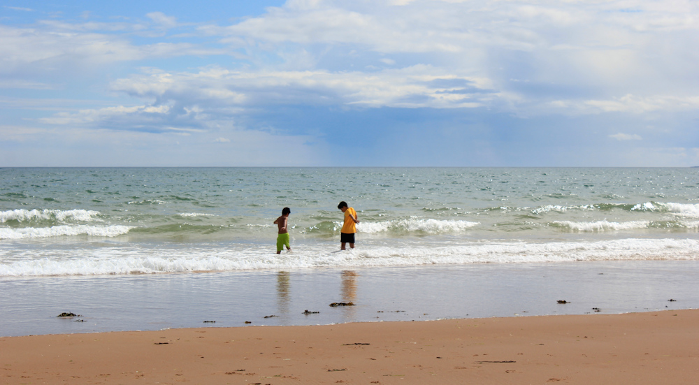There are people in the sea, lovers strolling on the sands, children playing in the shallows. I don’t normally snap photographs of children, but I can’t resist these two young boys who are jumping – and squealing – in the cold froth of the waves.