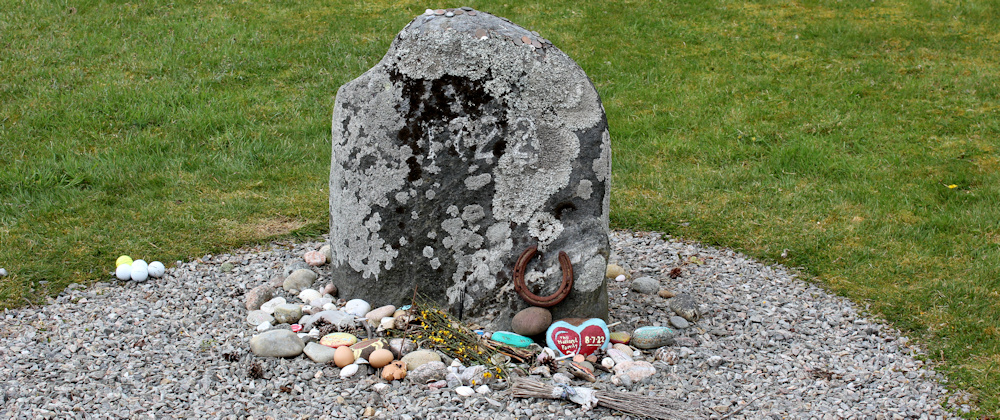 I walk round to the other side of the garden to get a better look. Although the stone is in a private garden, people have left memorial tokens – pebbles, painted stones, a horseshoe, and some dried flowers.