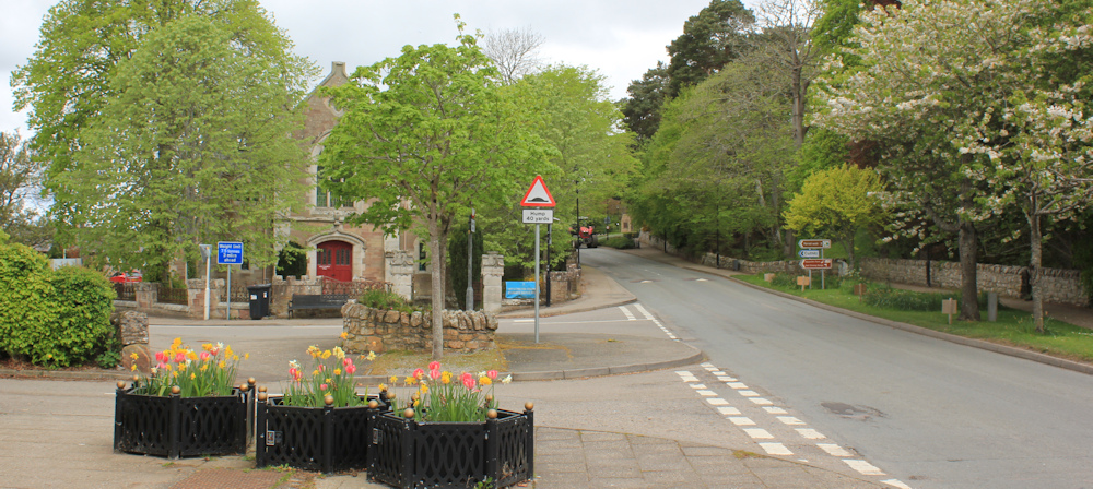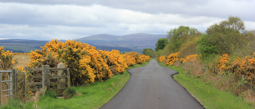 I reach a hamlet called Lowmore, with a row of houses and cottages to my left. Street lamps line this stretch of road – which seems odd for such a tiny number of residential properties. The verges are bright with blossom and broom. Just past the buildings, a car turns up the hill towards the forestry car park.