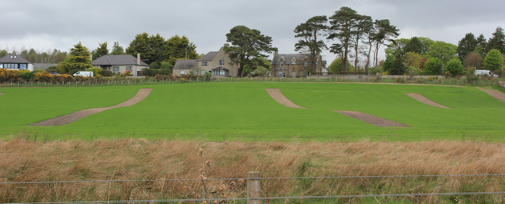 I’m walking parallel to the main road at this point. Looking across the fields, I can see traffic trundling along the ridge, with some fine houses on the other side of the road. The fields are marked with several strange stripes – bare strips of ground with no crops. Why? A mystery.