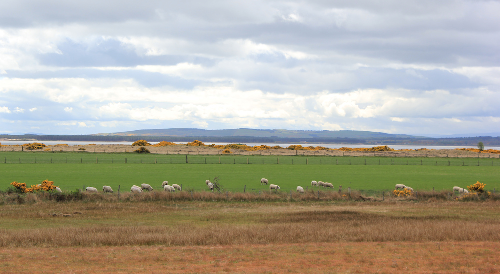 What a view they have. Fields of sheep, the raised line of sand dunes, and the waters of Dornoch Firth in the distance.