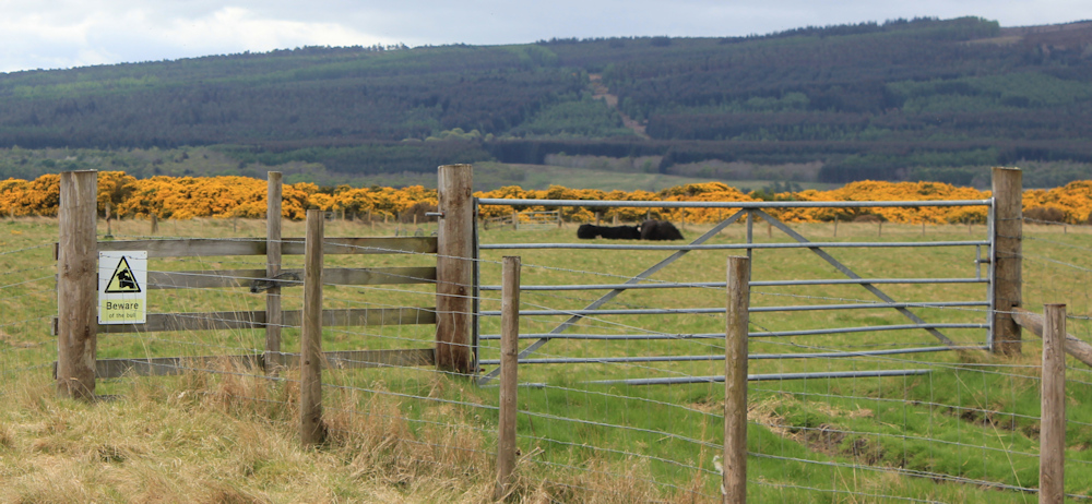 Now, the road takes a shart right-angled turn, before heading 1/4 mile or so northwards to join the A9. This is a treacherous road to walk beside, but I am hoping to follow a track that leaves the road – going straight ahead beyond the gate – and joins the A9 a little further down.
