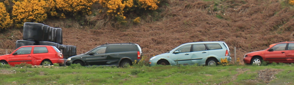Something strange to my right. A raised mound and a line of cars parked, apparently, in the middle of nowhere. What’s hidden behind that mound? A quarry?