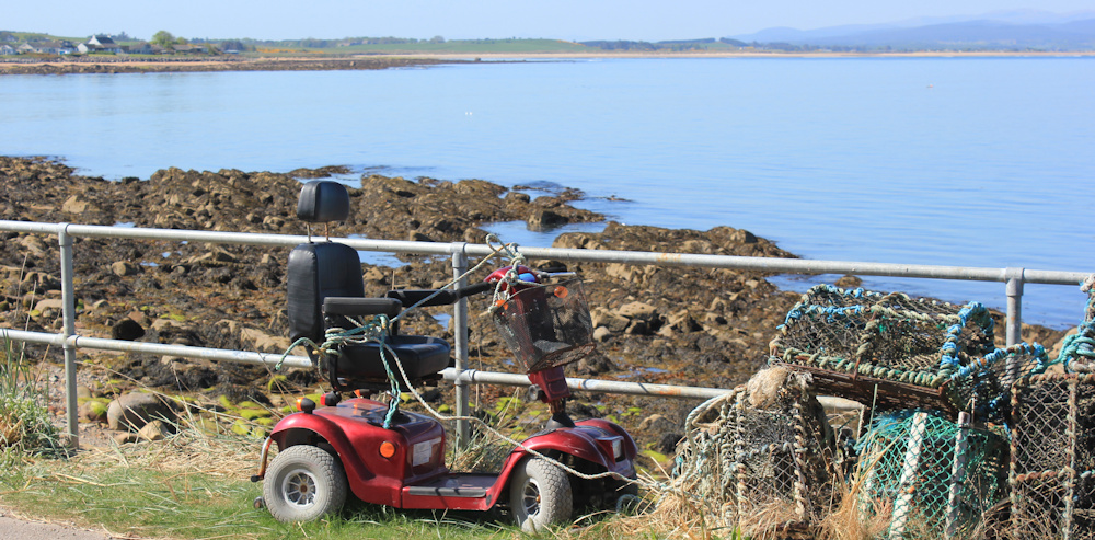 Walking along the road, I am struck by the juxtaposition of a mobility scooter with some piled-up lobster pots. The scooter is tied to the railing – like a horse – by a variety of ropes and twine!