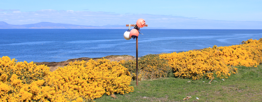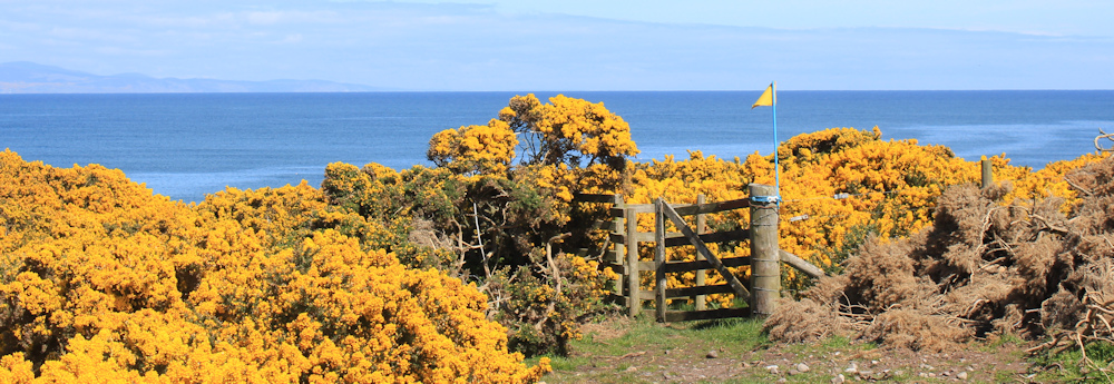 The paths leaves the shore, winding up through bushes to reach a higher point. Across a patch of open land, a yellow flag marks the gate where the path continues. Why a yellow flag? Helpful, I guess, but the same colour as the gorse!