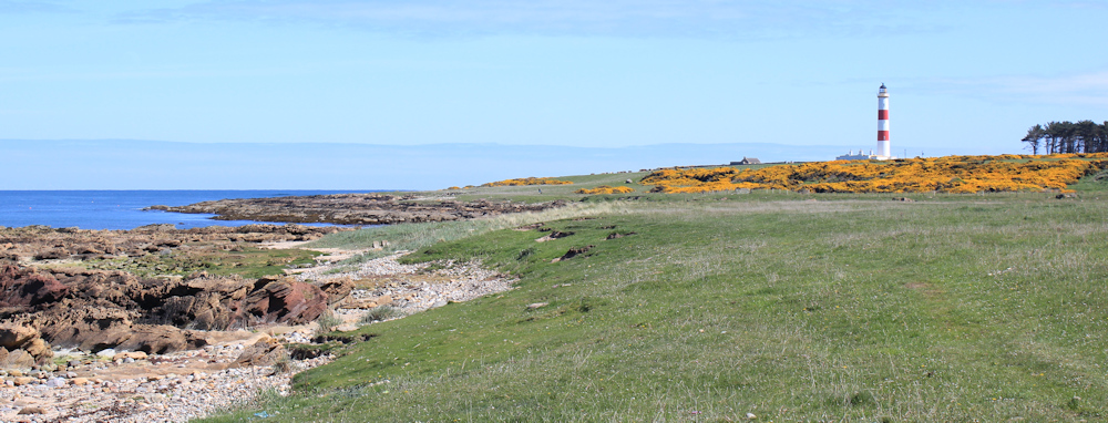 Onwards. I’m out of the gorse and crossing another grassy field. Ahead is the lighthouse on Tarbat Ness. Imposingly tall, and I love the red and white stripes – unusual, as most of the lighthouses around the coast are a creamy/orange colour.