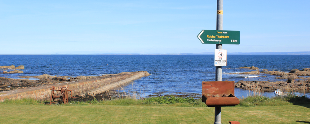 … and runs past (or through) people’s gardens to reach the road. Here is a stone jetty, a green space, and a sign telling me that Tarbatness is only 5 km away.