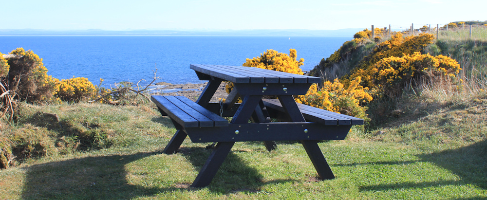But I am more interested in the table and bench at the top of the space, with a fine view over the coast. I sit down for a rest, swig some more water, and find a last cereal bar at the bottom of my rucksack!