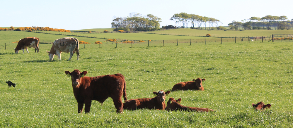 The products of his amorous conquests lie scattered around the fields. Cute little calves, their coats glowing chestnut-brown in the evening sunshine.